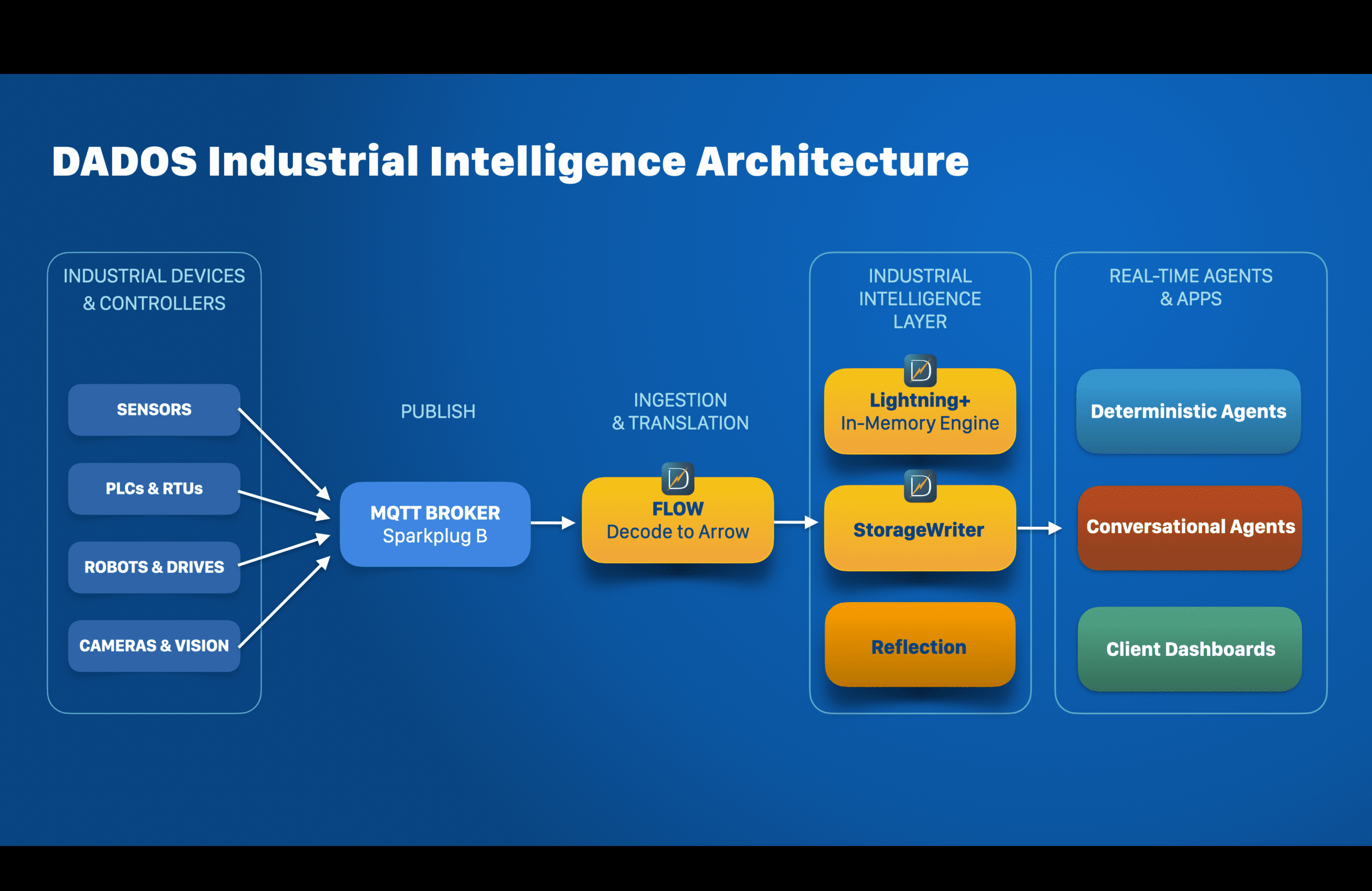 DADOS delivers decision-ready industrial state in milliseconds by converting live Sparkplug B telemetry into queryable Apache Arrow tables for control. Industrial intelligence only matters if it allows decisions within the control timing-window. Anything slower is too late to matter.